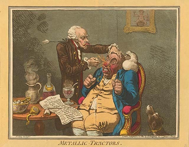One of the more popular subjects for caricature in the Georgian age was the figure of the quack doctor. In 1801, James Gillray etched a print entitled, Metallic-Tractors (shown below). This took the piss out of an American doctor named Elisha Perkins, who was the inventor of the Perkins Tractors. These might sound like farming equipment, but they were actually a simple pair of short, metal rods, and Perkins claimed that by touching them to the skin they could draw out many diseases, including rheumatism, epilepsy, inflammation, and disorders of the face.